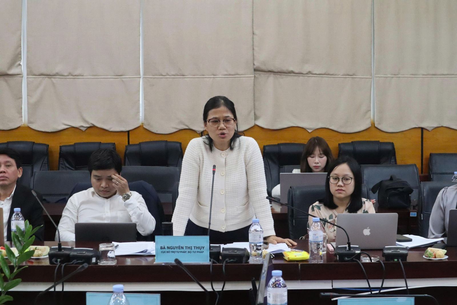 Bà Nguyễn Thị Thuỵ, Trưởng phòng Thanh tra bổ trợ tư pháp và Quản lý giám định tư pháp, Cục Bổ trợ tư pháp, Bộ Tư pháp phát biểu tại Hội thảo.
