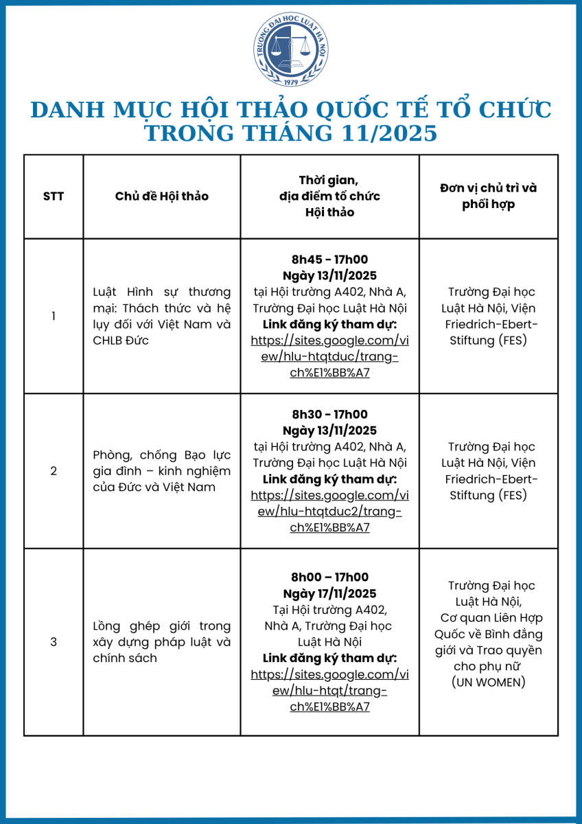 Danh mục Hội thảo quốc tế được tổ chức trong tháng 11/2025 tại Trường Đại học Luật Hà Nội