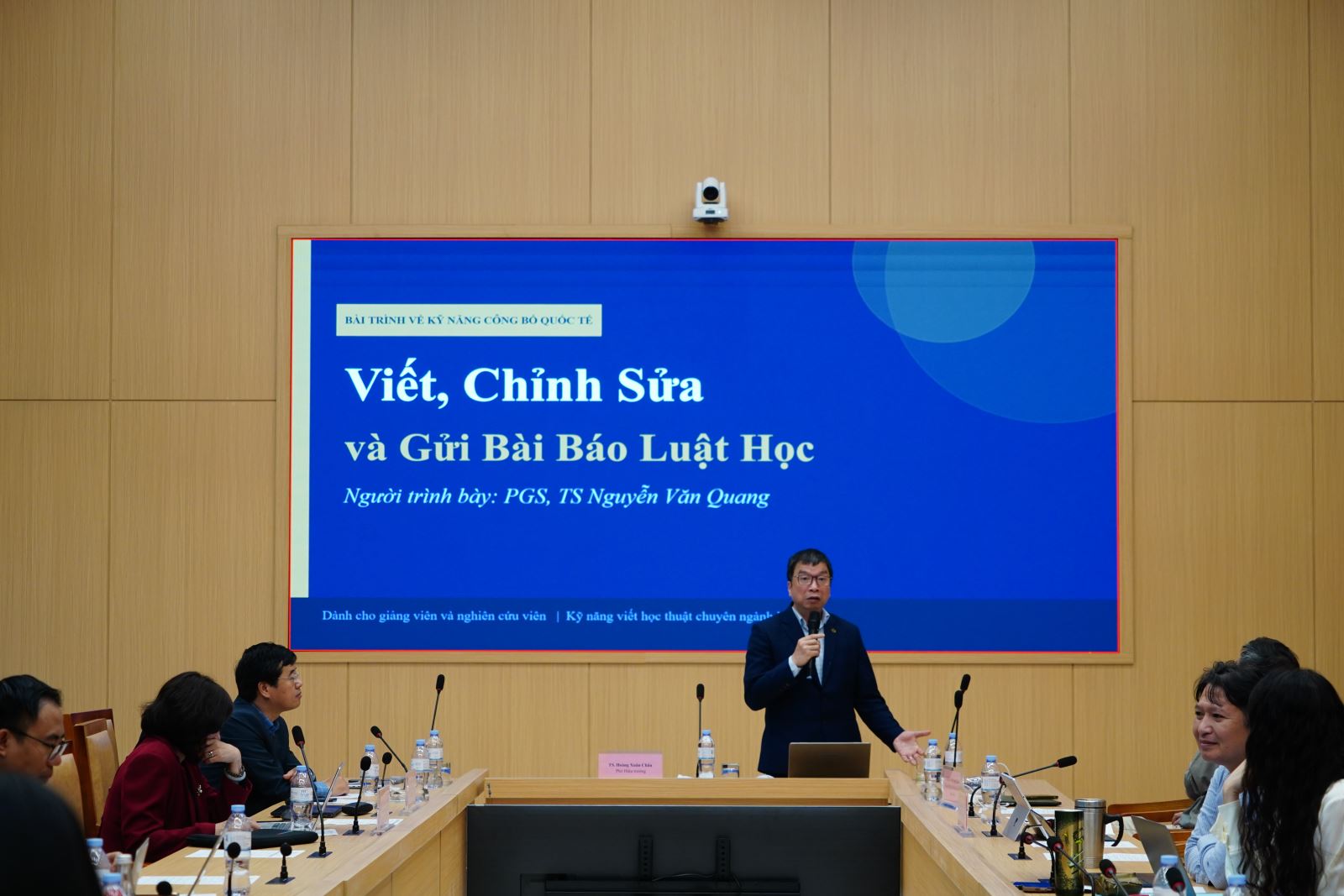 Tiếp đó, PGS.TS. Nguyễn Văn Quang đã trình bày báo cáo tới  giảng viên và nghiên cứu viên về quy trình viết, chỉnh sửa và gửi bài báo luật học.